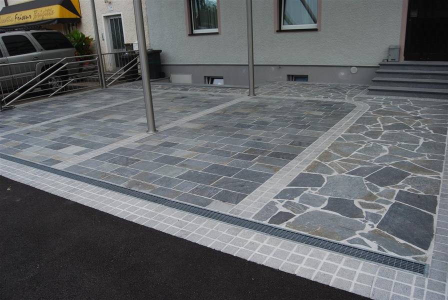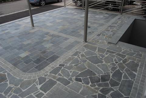 Anmerkung: Karistou (Karistos) Quarzit - Schwarz Blau mit Braunen Adern ist ein frostfester Quarzit. In der Fläche verlegt wirkt er elegant, aber durch die spaltrauhe Oberfläche hat er auch eine rustikale Komponente. Spaltrauh bedeutet »rauh, wie es beim Spalten entsteht«, die Oberfläche ist optisch mit Schiefer zu vergleichen.